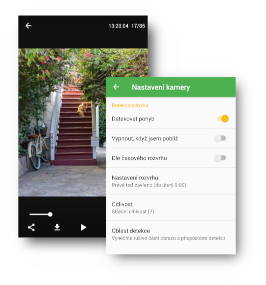 - Plánovač, detekce blízkosti, siréna: Pro přizpůsobení detekce pohybu vašim potřebám.